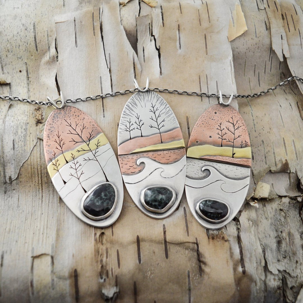 These incredible new pendants feature stunning Michigan Greenstone, straight from the waves of Superior herself. They're made with recycled sterling silver and brass, and local copper from the old White Pine Mine near Ontonogan, Michigan.
