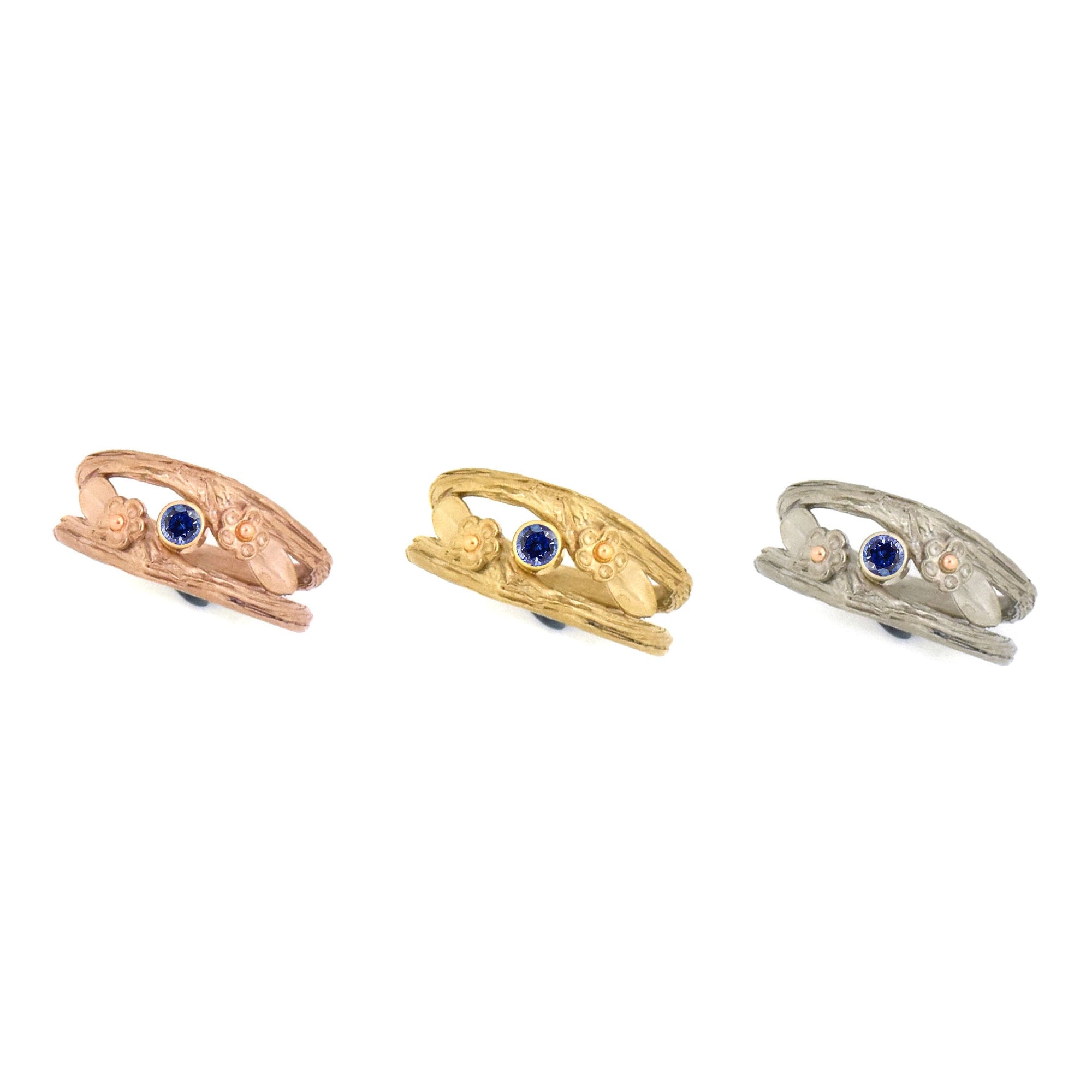 • white gold with droplets in center of flowers in rose gold (pictured).