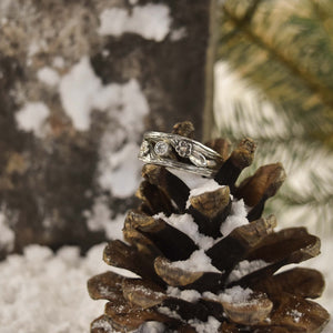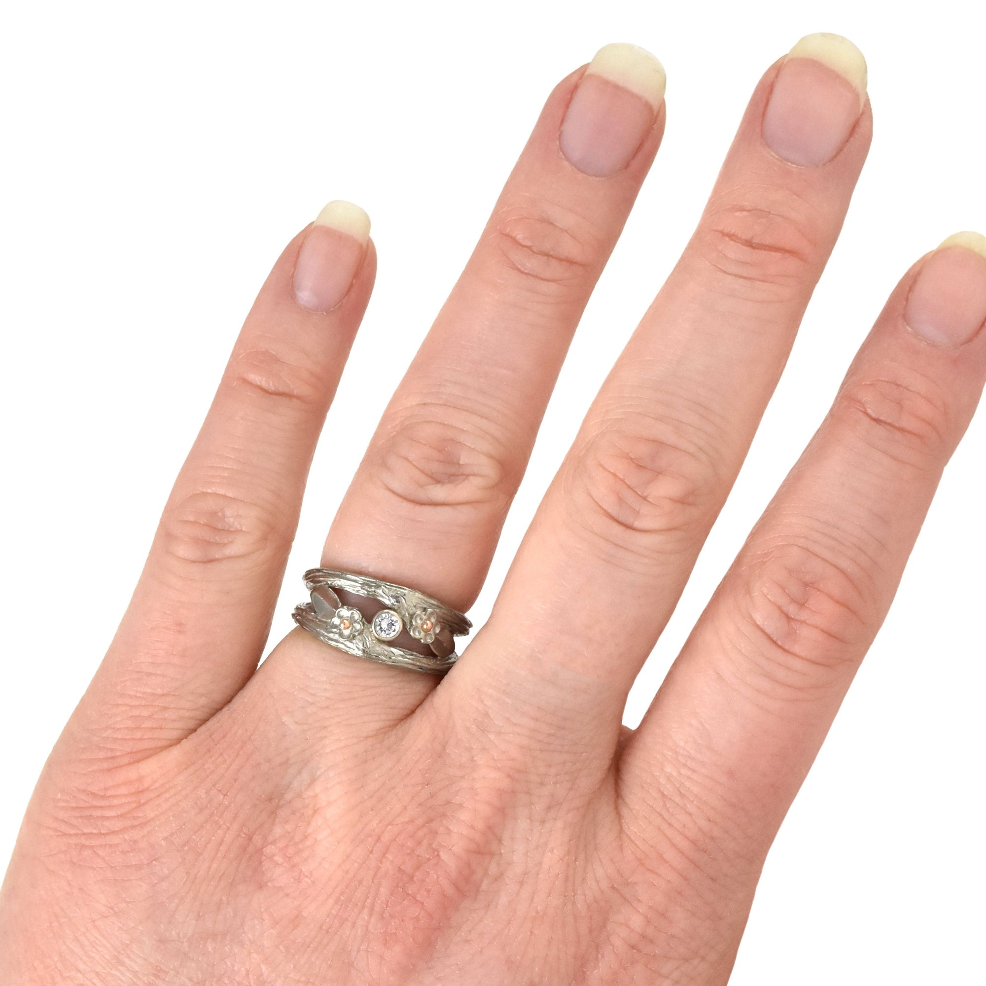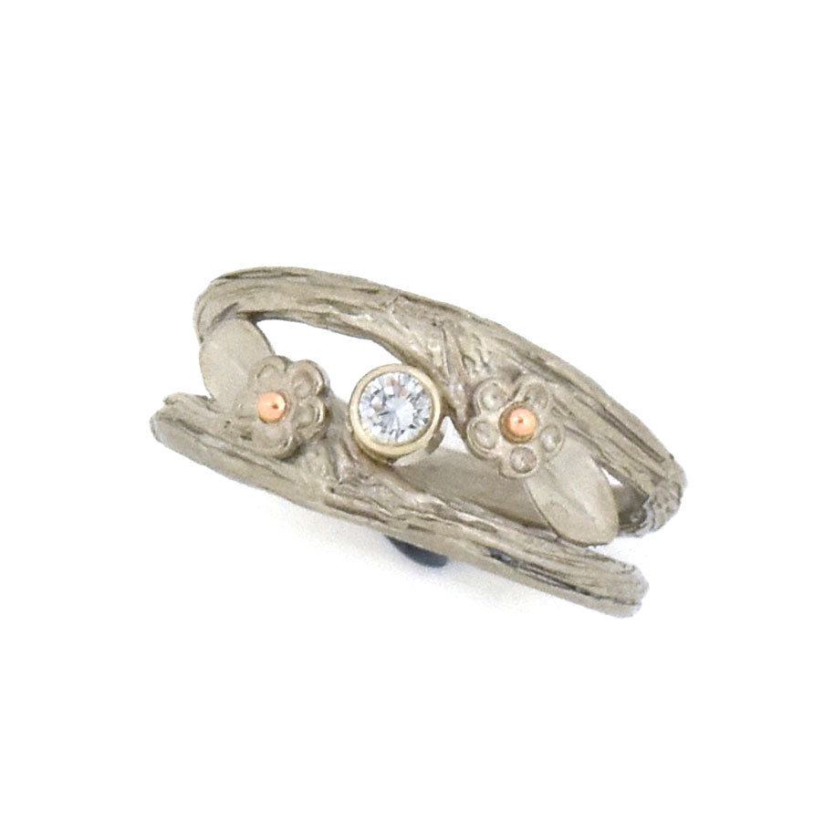 Let your love forever blossom with this romantic flowering twig ring. Pretty yet rustic and unique, the blossoming romance ring will be a reminder of keeping the romance of a relationship strong even as you celebrate many years together. The comfortable double band style and snag-free stone setting makes this ring easy to wear.